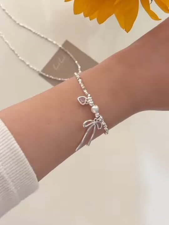 A close-up of a wrist adorned with a dainty silver bracelet featuring small beads, a heart charm, and an elegant bow detail. The soft lighting and minimal background highlight the bracelet’s feminine and graceful design.