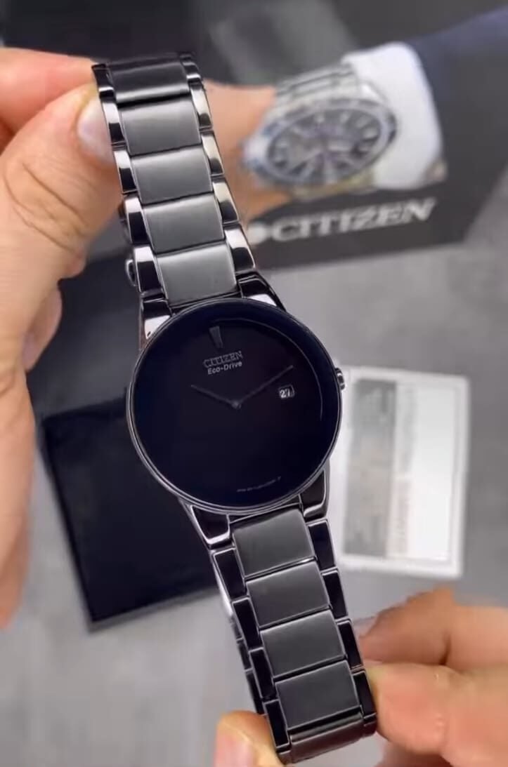 A hand is holding a modern, minimalist Citizen wristwatch with a black round dial and a polished stainless steel bracelet. The watch has a clean, simple face with subtle branding and no visible numerals, giving it a sleek and elegant look. In the background, a Citizen watch box and paperwork are visible, suggesting it is new or recently purchased.