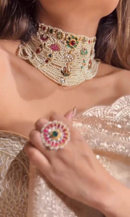 An exquisite kundan choker necklace adorned with finely set pearls and multicolored gemstones, creating a regal and sophisticated look. The wide choker design sits elegantly on the neckline, enhanced by traditional detailing and vibrant stone accents. Paired with a matching floral kundan ring, this set is perfect for bridal wear, receptions, or grand festive occasions, adding timeless charm and luxury to any ethnic outfit.