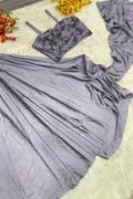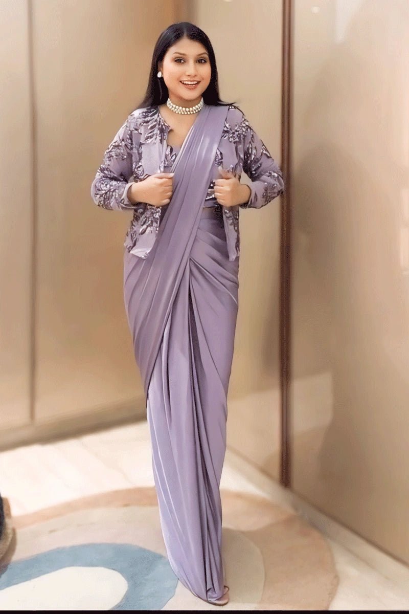 Aa stylish lavender ready-to-wear saree modern ane elegant look mate perfect chhe. Saree ma lightweight fabric (georgette/chiffon type) use thayel chhe je smooth drape ane flowy finish aape chhe. Pre-stitched design hoy etle pehrava ma easy ane quick chhe.