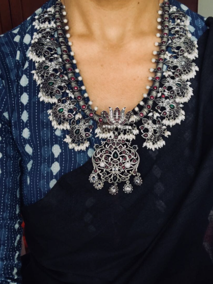 Elevate your ethnic look with this stunning oxidized silver choker necklace, featuring intricate handcrafted detailing and traditional motifs. The antique finish paired with delicate bead accents adds a touch of vintage charm, making it a perfect accessory for festive occasions, weddings, or cultural celebrations. Lightweight yet bold, this statement choker beautifully complements sarees, lehengas, and Indo-western outfits, adding timeless elegance to your jewelry collection.