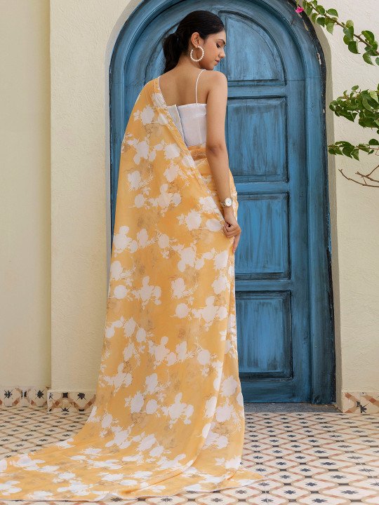 Aa beautiful peach color saree soft ane elegant look mate perfect chhe. Saree ma lightweight georgette fabric use thayel chhe je smooth drape ane flowy finish aape chhe. Saree par subtle floral print chhe je outfit ne fresh ane graceful look aape chhe.