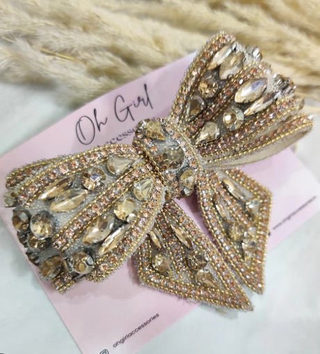 Make a bold style statement with this premium gold bow hair accessory, exquisitely detailed with shimmering crystals, rhinestones, and fine beadwork. The luxurious design adds instant elegance and sparkle, making it perfect for parties, weddings, festive occasions, or special evenings out. Crafted to provide a secure hold while enhancing your hairstyle, this glamorous bow clip effortlessly elevates both modern and classic looks. An ideal accessory for those who love sophisticated, standout details.