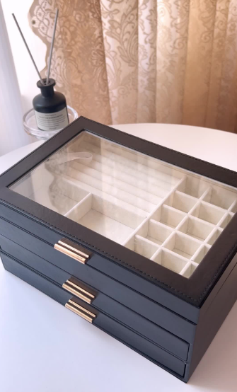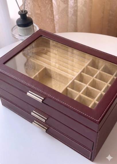 Keep your jewelry beautifully organized with this elegant multi-drawer jewelry organizer box. Designed with a clear glass top and multiple compartments, it allows you to easily view and store rings, earrings, necklaces, and other accessories. The spacious drawers provide additional storage while keeping your precious items safe from dust and damage. Its sleek and modern design adds a sophisticated touch to any vanity or dressing table, making it perfect for organizing your jewelry collection in style. 💍✨