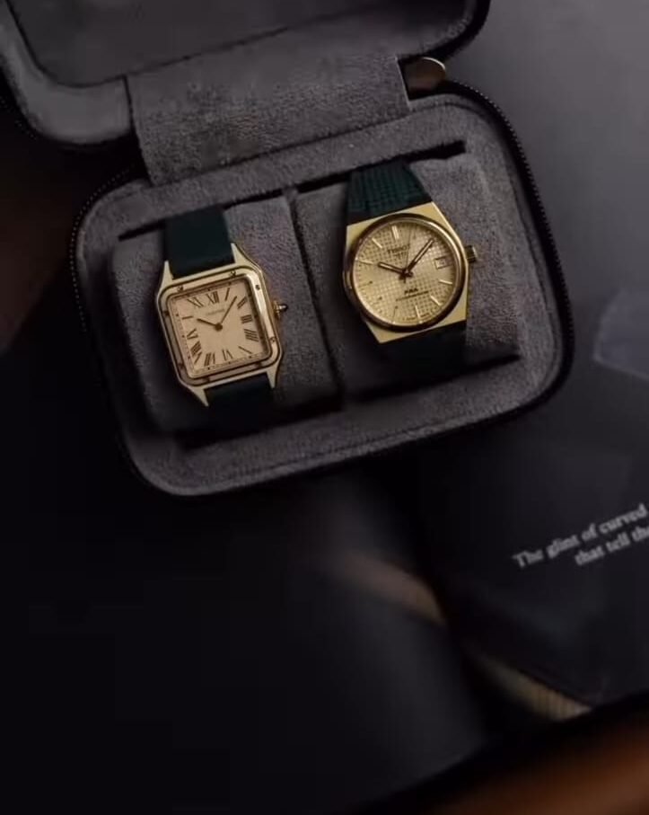 A premium couple watch set featuring two elegant gold-toned wristwatches—one with a rectangular dial and the other with a classic round dial. Both watches are neatly displayed in a sophisticated black presentation box, making them ideal for gifting. The refined design and timeless style make this set perfect for anniversaries, weddings, or special occasions, offering a touch of luxury and elegance for both men and women.