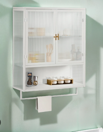 Maximize your bathroom space with this elegant wall-mounted storage cabinet. Designed with ribbed glass doors and a sleek white frame, it keeps toiletries, skincare products, and essentials neatly organized while maintaining a clean, modern look.