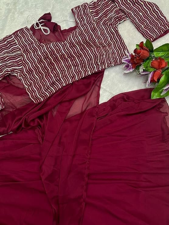 Aa stylish wine pink ready-to-wear saree modern ane trendy look mate perfect chhe. Saree ma lightweight fabric (georgette/chiffon type) use thayel chhe je smooth drape ane flowy look aape chhe. Pre-stitched style hoy etle pehrava ma easy ane time-saving chhe.
